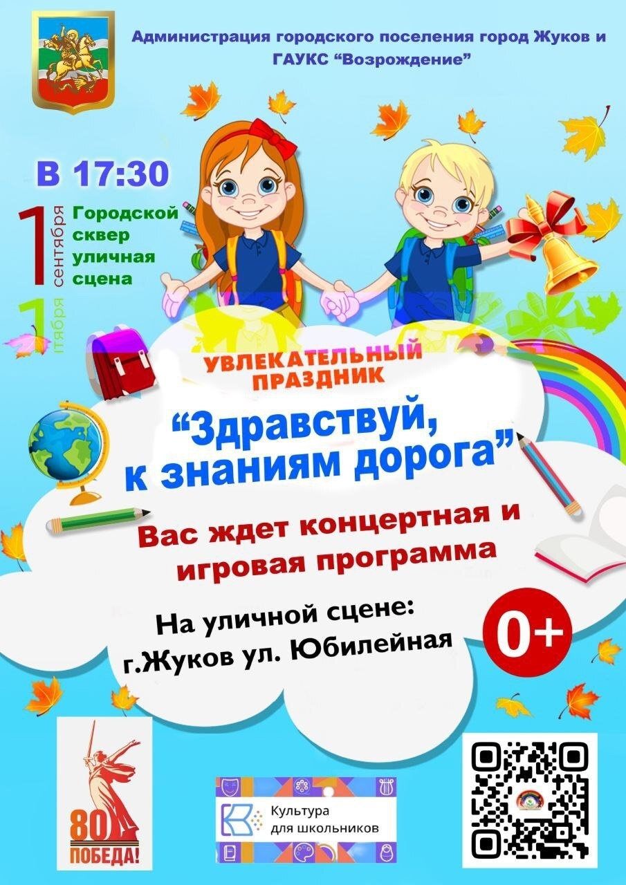 Друзья, приглашаем вас окунуться в атмосферу радости и веселья вместе с нами на празднике «Здравствуй, к знаниям дорога».Начало учебного года – это всегда особенное время, наполненное новыми открытиями, приятными встречами и яркими эмоциями.Приходите всей семьей, зовите друзей и соседей! Пусть начало нового учебного года будет ярким и запоминающимся событием, которое подарит вам заряд позитива и вдохновения на весь год вперед. Когда? 1 сентября в 17:30 и Где? Уличная сцена городского сквера — г.Жуков, ул.Юбилейная. Ждем вас на этом замечательном празднике!