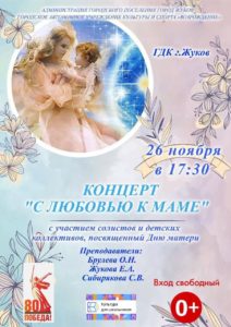 Друзья !С радостью приглашаем вас на праздничный концерт » С любовью к МАМЕ», посвященный Дню матери! Этот особенный день — возможность выразить нашу безмерную благодарность и уважение самым дорогим и близким людям в нашей жизни — нашим матерям. Концерт состоится 26 ноября в 17:30. Ждем вас с нетерпением на празднике, который наполнит наши сердца любовью и гармонией! Место встречи — г. Жуков, ул. Гурьянова, д. 2 (ГДК ГАУКС «Возрождение»).