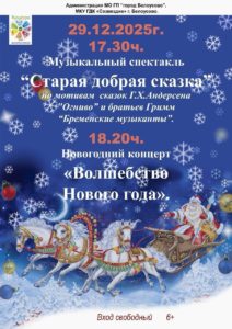 С радостью приглашаем вас на музыкальный спектакль «Старая добрая сказка» созданный по мотивам сказки Г. Х. Андерсена «Огниво» и братьев Гримм «Бременские музыканты» и обещает погрузить зрителей в волшебную атмосферу зимних чудес. Спектакль состоится 25 декабря в 13:00 и 15:00 в нашем Дворце Культуры.
