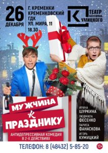 Друзья! Вы давно ходили в театр? Тогда приглашаем вас 26 декабря в Кременковский Дом культуры на яркую и антидепрессивную комедию — «Мужчина к празднику«, да-да, именно так называется спектакль, который мы вам предлагаем посмотреть. Всё начнётся в 18:30. В главных ролях артисты Калужского областного драматического театра: Ирина Шуркина, Игорь Кумицкий, Людмила Фесенко, Лариса Фанаскова. Всем обеспечен веселый и антидепрессивный вечер! Заказ билетов по телефону: 8 (48432) 5-85-20, г. Кременки, ул. Мира, д. 11.